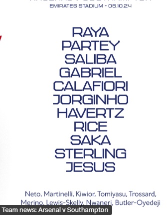 Subs: Neto, Martinelli, Kiwior, Tomiyasu, Trossard, Merino, Butler-Oyedeji, Lewis-Skelly, Nwaneri.
