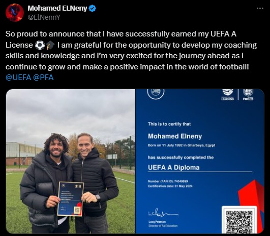 The 32 year old Egyptian who was once our longest serving player just before his departure last season announced on his X (Twitter) account of his acquisition of the UEFA ‘A’ License after undergoing training for a coaching role in the future.