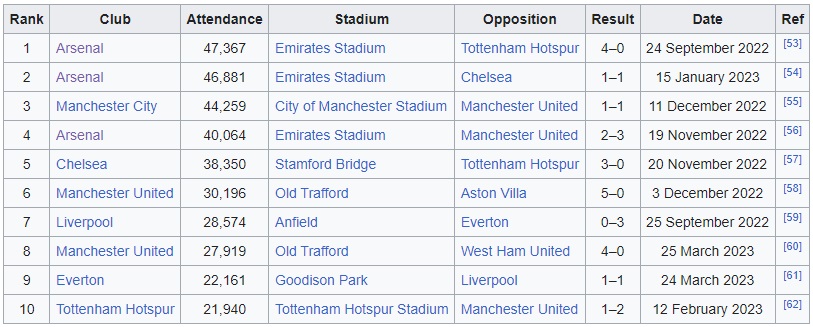 - Arsenal Women set the highest ever WSL attendance record at 47,367 when they welcomed Tottenham to the Emirates for the North London derby in September 2022