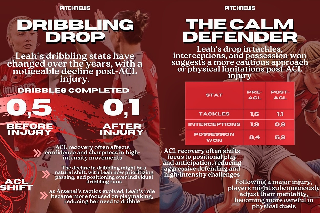 Apparently before the injury Leah averaged a 0.5 dribble rate per 90 minutes, but she’s now only averaging 0.1. It is suggested that from her ACL injury, her confidence and sharpness in high-intensity movement might have just been affected. Well, and as she’s resorted to playing them, it seems she’s really getting better at them, as stats suggest, over the seasons.