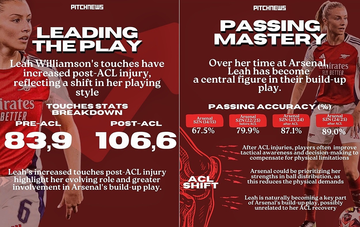 Leah Williamson has apparently evolved from being the dribble defender to that defender who is focusing on her position and playing those passes, thus focusing more on trying to be a deep-lying playmaker. The club might have opted to capitalise on her strengths in ball distribution, as this reduces the physical demands laid on her before the injury.