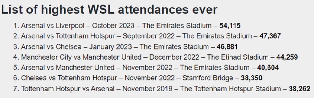 Arsenal Women are at the forefront of driving attendance figures, responsible for 5 of the top 7 WSL attendances ever., as detailed below.
